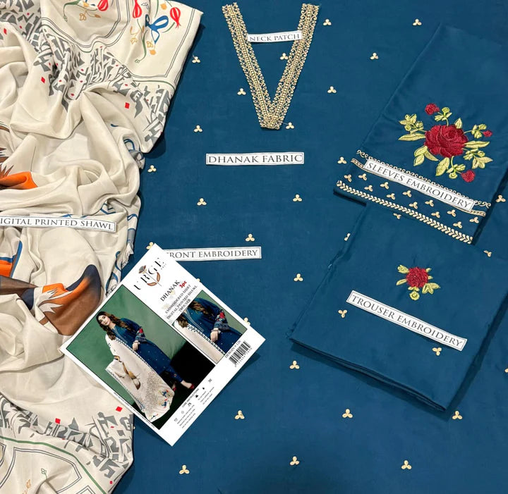 The Aisling Dhanak Embroidered 3 Piece | AL104 is a refined blend of elegance and tradition, designed to bring grace and sophistication to your winter wardrobe. Crafted from high-quality dhanak fabric, this three-piece suit offers warmth and comfort without compromising on style. The teal blue shirt features delicate embroidery with minimal embellishments across the front, paired with beautifully adorned floral embroidery on the sleeves that add a touch of vibrancy. Its straight silhouette and fine craftsmanship make it suitable for both casual day wear and semi-formal occasions, offering a versatile styling option.