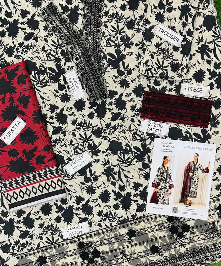 Crafted from premium-quality khaddar, the outfit features an ivory base beautifully adorned with intricate black floral embroidery that exudes grace and femininity. The delicate detailing along the neckline and sleeves highlights Zainab Chottani’s masterful artistry, while the subtle geometric patterns enhance the visual texture of the ensemble. The scalloped borders add a touch of modernity, balancing tradition with contemporary flair.